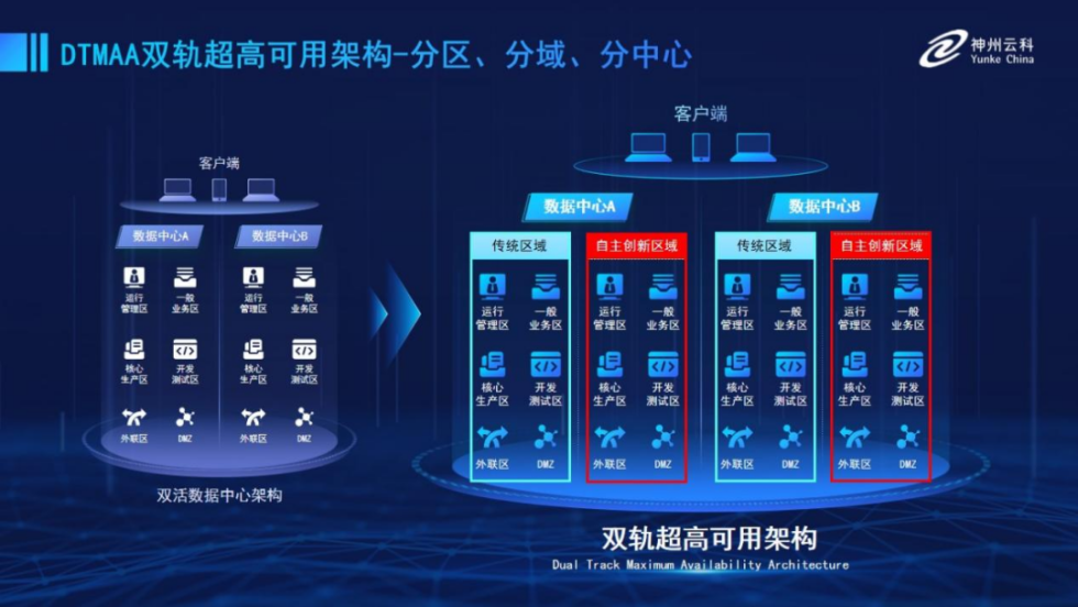 为帮助金融客户更好地应对数字经济时代对可持续性的高要求,实现“信创”与“数字化”齐头并进,酷游九州推出了双轨超高可用架构。该架构在双活数据中心的分区调度基础上,增加信创域和非信创域的分域调度,实行信创域与传统域应用全量部署,使双中心运营变为双中心四区域并行运行,互为多活,将“0到1”的单轨建设道路变为分区分域协同的多活双轨超高可用架构。帮助客户在新架构下,保障“信创”的同时解决性能瓶颈,提升稳定性,保证应用可持续性,最终实现信创区域和非信创区域的平滑过渡,完成国产化替代目标。