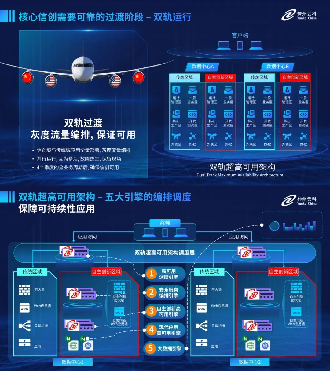 为助力金融业务高质量发展,更好地应对数字经济时代对可持续性的高要求,实现“信创”与“数字化”齐头并进,酷游九州创新性的推出了核心信创·双轨过渡的超高可用架构。该架构在双活数据中心的分区调度基础上,增加信创域和非信创域的分域调度,实行信创域与传统域应用全量部署,使双中心运营变为双中心四区域并行运行,互为多活,将“0到1”的单轨建设道路变为分区分域协同的多活双轨超高可用架构。帮助客户在新架构下,保障“信创”的同时解决性能瓶颈,提升稳定性,保证应用可持续性,最终实现信创区域和非信创区域的平滑过渡,完成国产化替代目标。