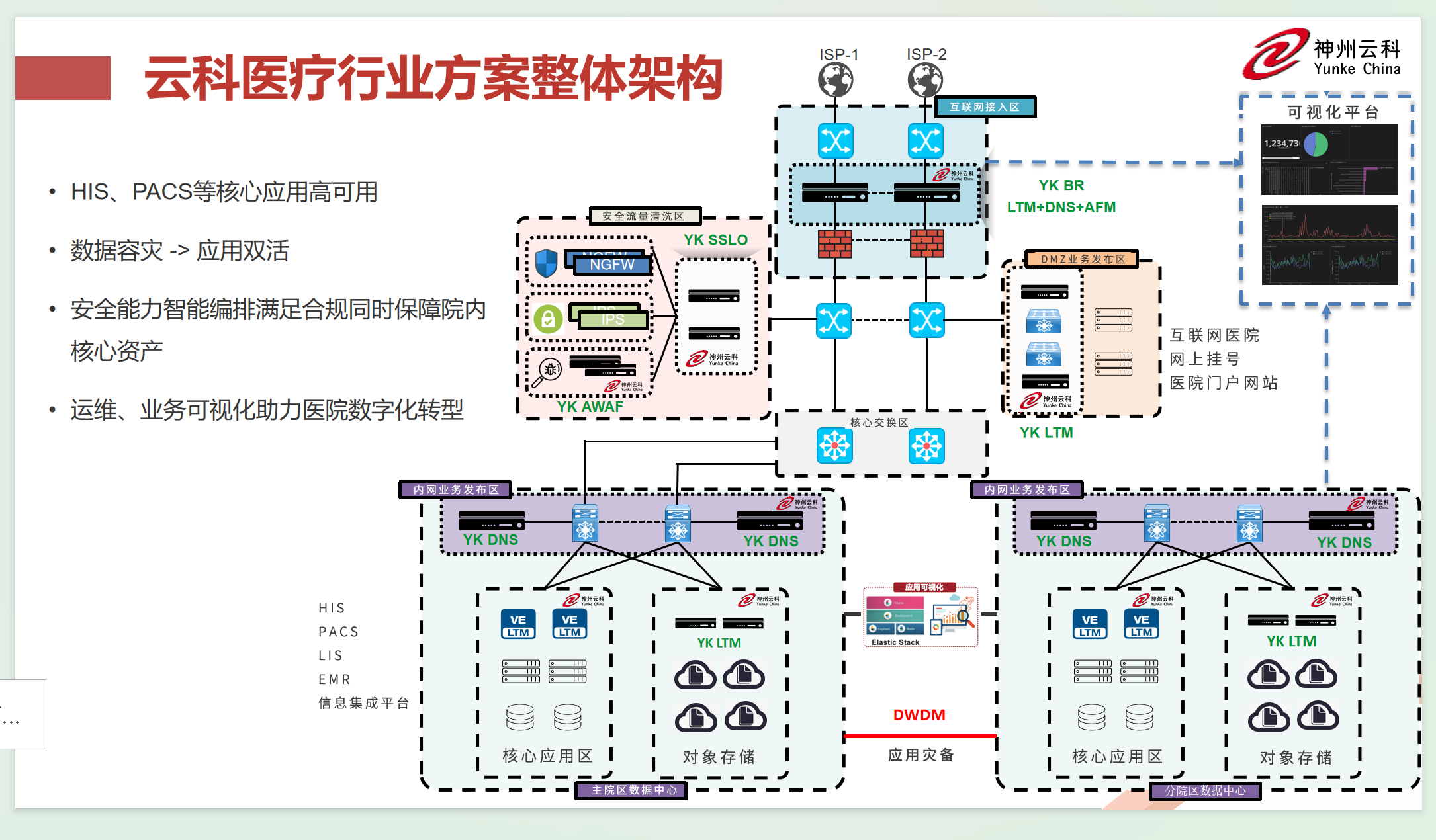 在电子病历4升5,以及互联互通五乙的评审要求中,均提出了核心系统RTO/RPO提出了小于15分钟的要求。酷游九州应用双活解决方案,拥有国内最多的双活实施案例,帮助医院用户轻松实现HIS、PACS、EMR等核心应用在单院区出现故障时的快速转院区访问,保障了医院应用系统的高可用性和高可靠性。