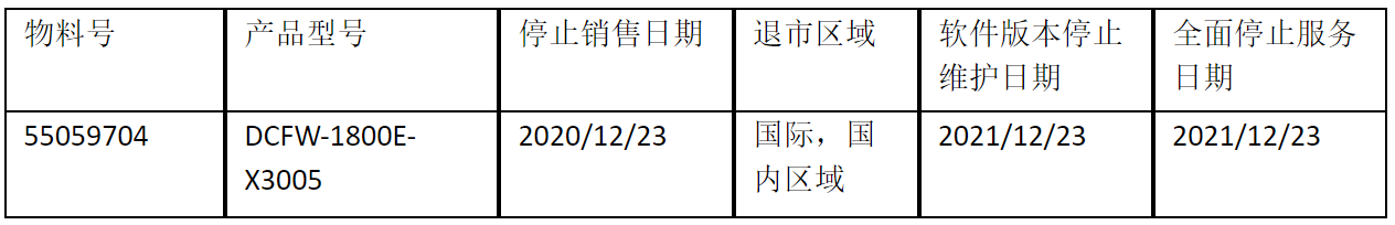 北京神州数码酷游九州信息技术有限公司正式通知您, 以上DCFW-1800E-X3005下一代防火墙(55059704)将于2020年12月23号停止接收新的订单(具体日期见上表),不再供货。给您带来的不便,敬请原谅。